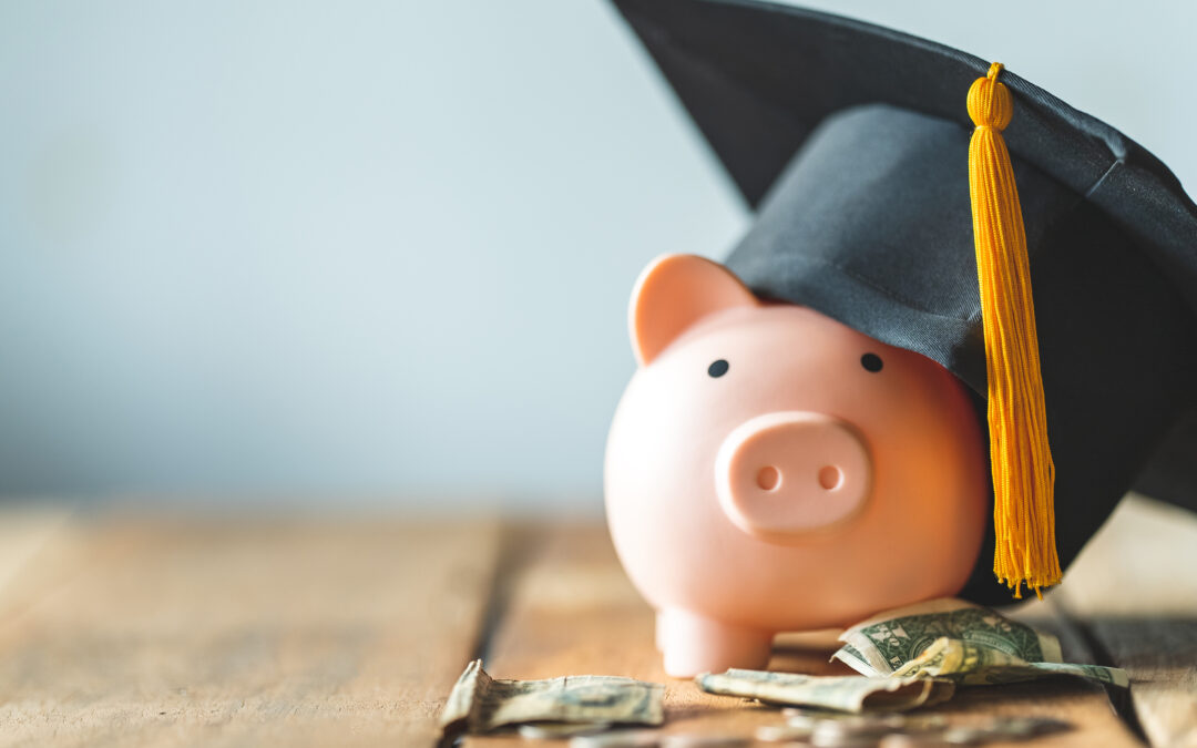 piggy bank With Graduation Cap on old wood,Money saving concept.